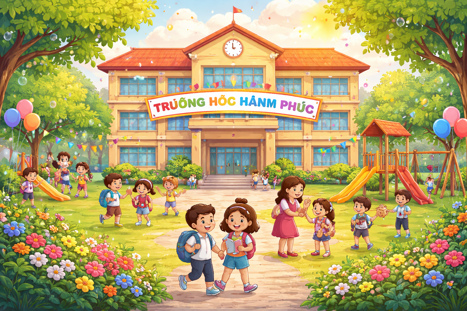 Để vẽ một bức tranh “Ngôi trường hạnh phúc” sinh động và ý nghĩa, bạn nên thể hiện những hình ảnh quen thuộc gắn với niềm vui học tập của học sinh và tình cảm giữa thầy cô với học trò. Dưới đây là một số gợi ý giúp bức tranh trở nên đẹp và giàu cảm xúc hơn: