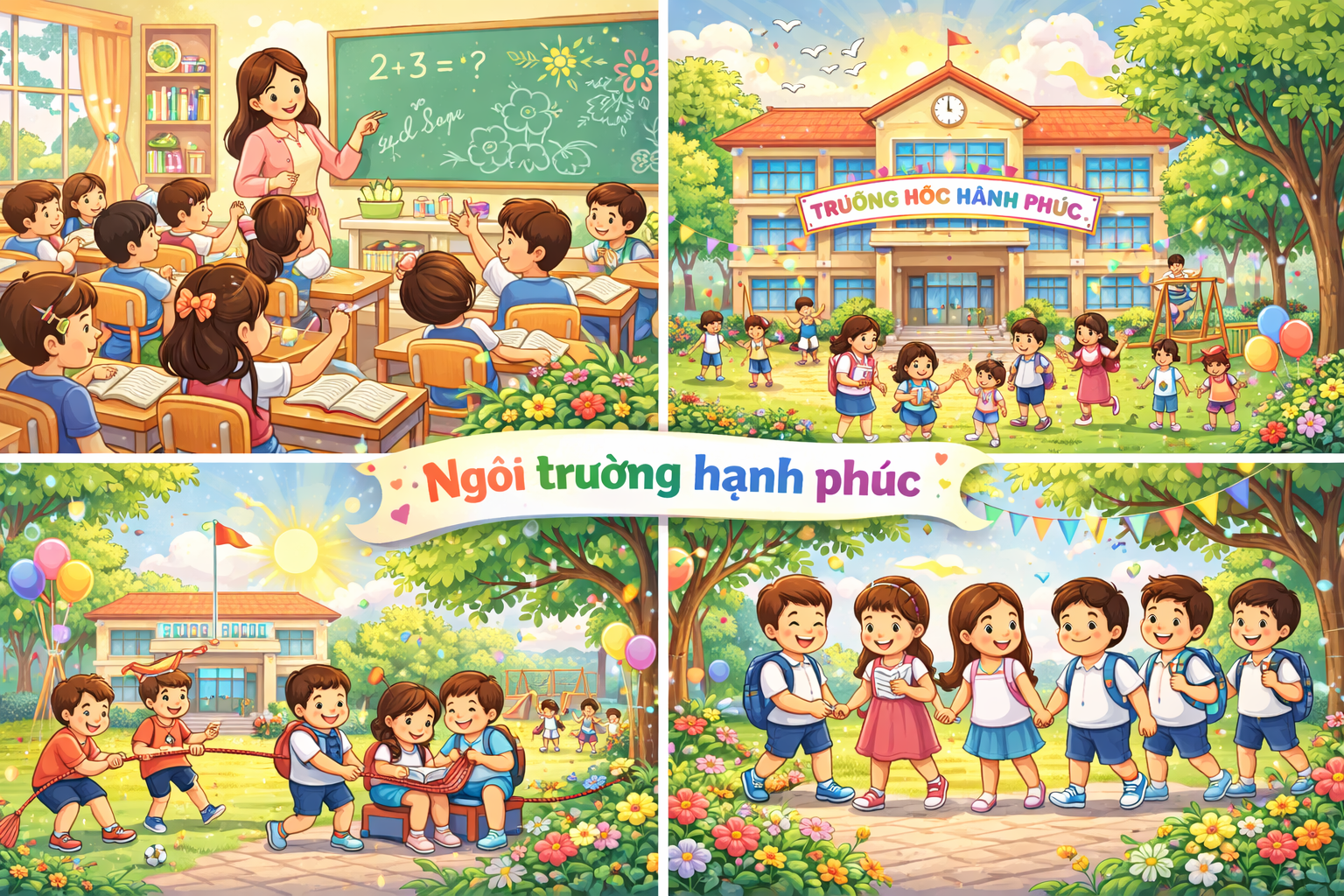 Theo mình hiểu thì “ngôi trường hạnh phúc” là nơi học sinh cảm thấy vui vẻ, an toàn và thoải mái khi học tập. Nhưng mình vẫn băn khoăn không biết nên vẽ những hoạt động nào của thầy cô và học sinh, hay nên thêm những chi tiết như sân trường, cây xanh, lớp học hoặc các bạn đang vui chơi.