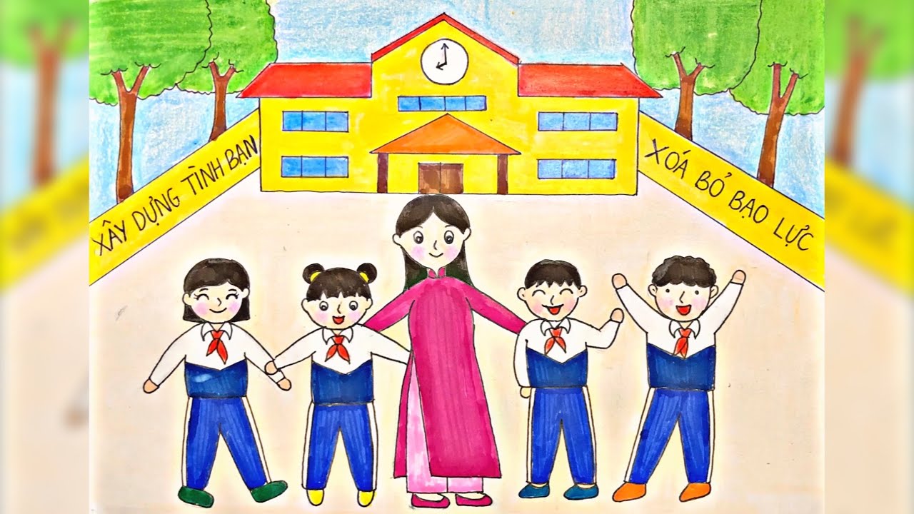 Bạn có thể vẽ các bạn học sinh nắm tay nhau, cùng học nhóm hoặc giúp đỡ nhau trong học tập. Điều này thể hiện sự thân thiện và gắn bó trong trường học.